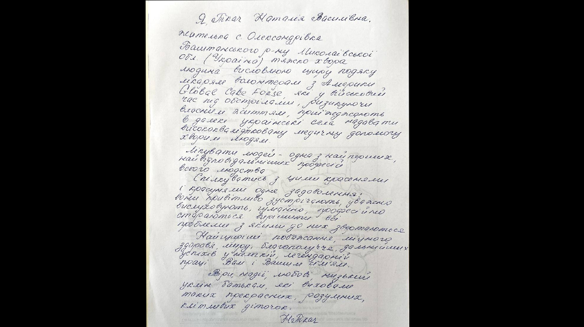 In the small village of Oleksandrivka in the Mykolaiv region of Ukraine, a woman named Natalia put pen to paper to express her heartfelt gratitude.